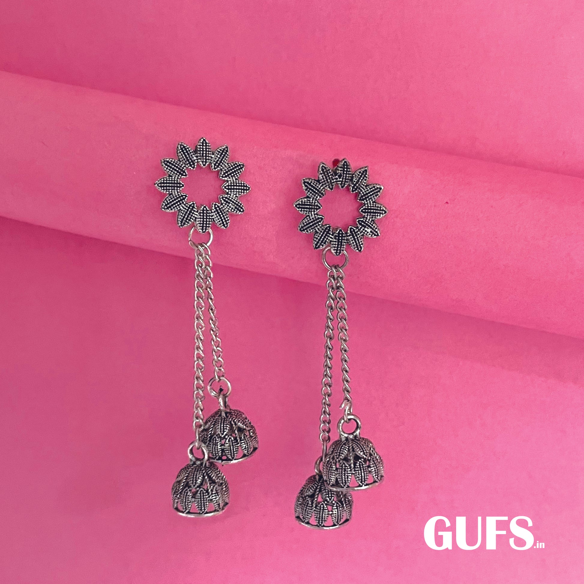 - Handcrafted by skilled artisans, oxidized silver jhumkas are often made with traditional techniques, ensuring that each piece is unique and carries the weight of artisanal excellence. The oxidized finish, in particular, adds to the vintage look, making these earrings look as if they have been passed down through generations.
